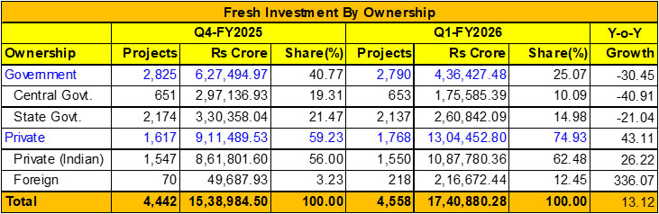 In the Government sector, between the two latest quarters, fresh investment decreased by 30.45%, i.e. from Rs 6,27,494.97 crore in Q4/FY25 to Rs 4,36,427.48 crore in Q1/FY26. As a result, its share in the total investment pie declined 40.77% in Q4/FY25 to 25.07% in Q1/FY26. Within this sector, the fall in fresh investment was sharper in the Central government sector at -40.91%. The Rs 1,75,585.39 crore aggregate investment indicated a fall in investment commitments by Rs 1,21,552 crore as compared with the previous quarter's figures.