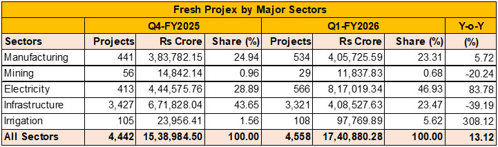 But for a couple of super-mega projects in the Metals sector, the sector would have witnessed a sharp decline in fresh investment in Q1/FY26. Those projects are a Rs 1,28,000 crore Aluminium Smelter project of Vedanta in Odisha, a Rs 50,000 crore Green steel project of JSW Steel and a Rs 40,000 crore Stainless steel project of Jindal Stainless, both in the state of Maharashtra.
