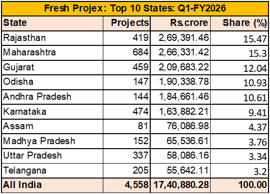 Following Maharashtra, Gujarat too witnessed a slippage in its rank from 2nd to 3rd in Q1/FY26. In all, the state attracted 459 projects worth 2,09,683.22 crore. After the top-ranked Rajasthan, Gujarat is the next state to benefit the most from the surge in new investment intentions in the Solar/Wind power projects. Around 85% of the total fresh investment the state attracted in Q1/FY26 was found in the Solar/Wind power sector. In all, projects worth Rs 1,78,950 crore investment was seen in this sector.