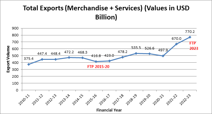 Figure 1: India’s total exports (merchandise + exports) from 2010-11 till 2022-23